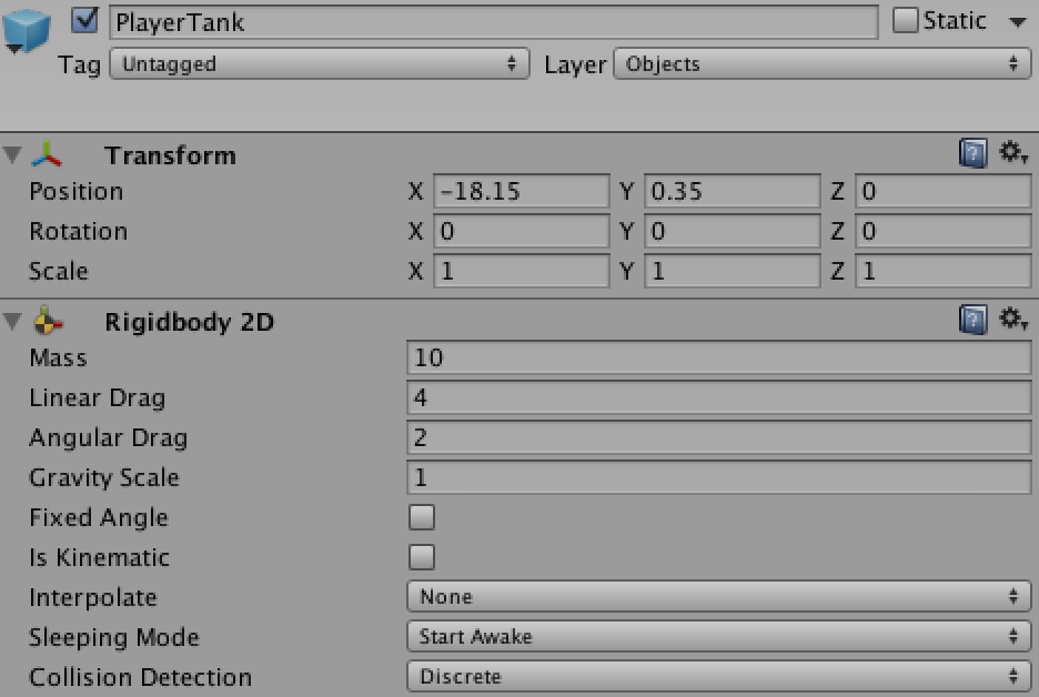 At last, the GameObject “PlayerTank” got a RigidBody 2D attached. It is used for moving the tank later with the WSAD keys. Please note, that I’ve modified the values for Mass, Linear Drag and Angular Drag. It’ll lead to a bit more realistic movement of the tank.