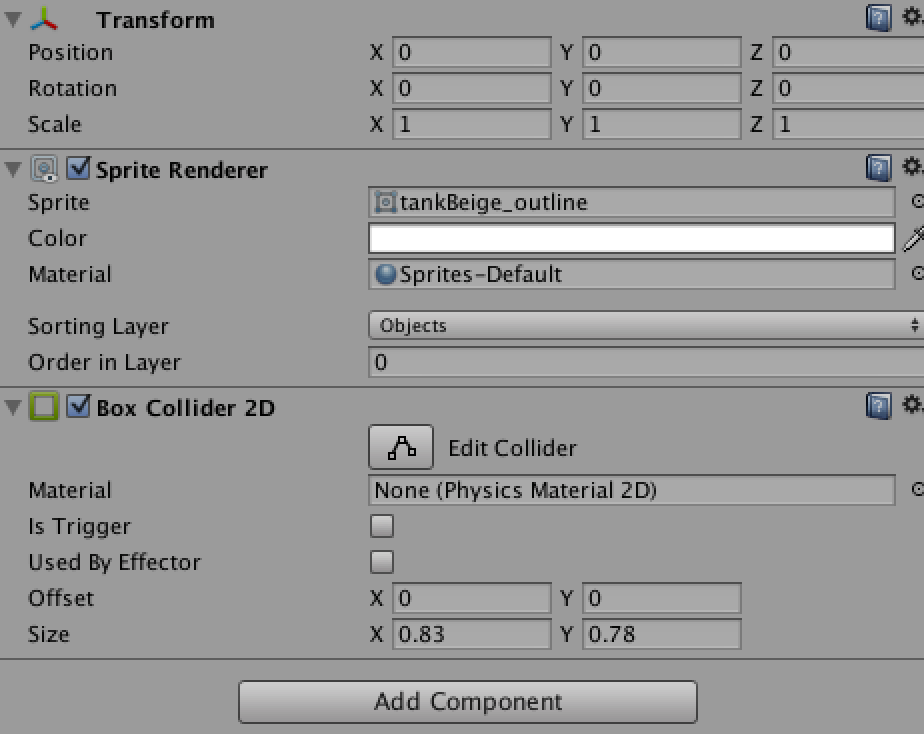 The “tankBeige_outline” (oh yes, I just was way to lazy to rename the original asset…) is made of a Sprite Renderer with default values and a Box Collider 2D, so we have easy collision detection later on. The same settings are used for the barrel, expect it’s missing a Box Collider 2D. I don’t feel it’s necessary that the barrel can collide with other things. The base of the tank should be fine for that.