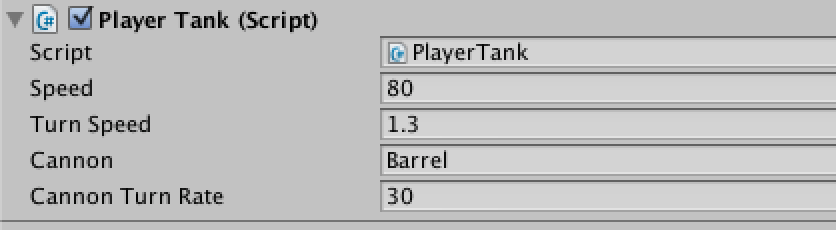 Speed: Maximum speed of the tank (more a maximum applied force to the tank to make it move).TurnSpeed: Maximum turn rate of the whole tank.Cannon: The GameObject which is used as a cannon. We will use it for rotating the cannon individually and let it follow the mouse.CannonTurnRate: The turn rate of the cannon when following the mouse. It simulates an inertia to not move instantly around.