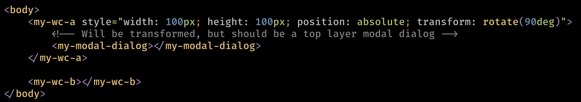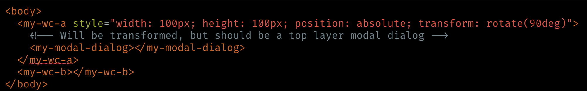 <my-wc-a style="width: 100px; height: 100px; position: absolute; transform: rotate(90deg)">