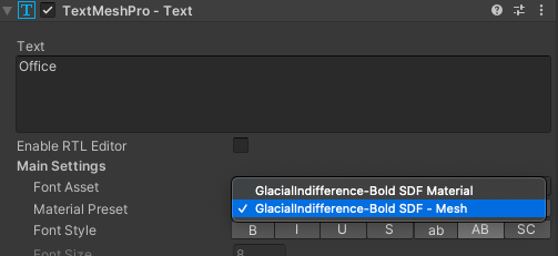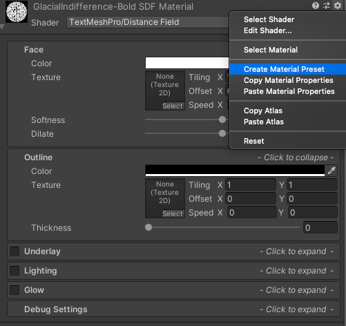 Rename it to something that you know, that this preset is either used for all TextMeshPro objects or all TextMeshProUGUI objects. And then assign that material to all objects: