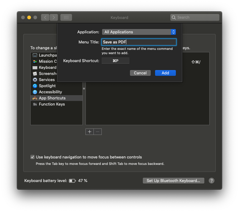 d) Now type in the exact name of the menu command to add. In my case, this is "Save as PDF" and as a shortcut I assign ⌘P as well. Then click the "Add" button.