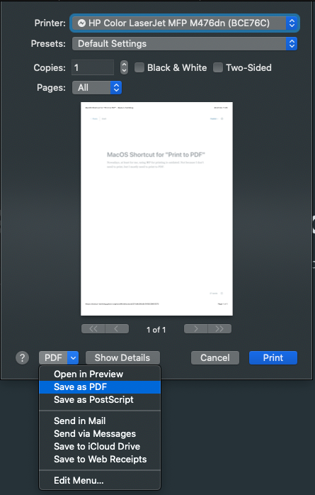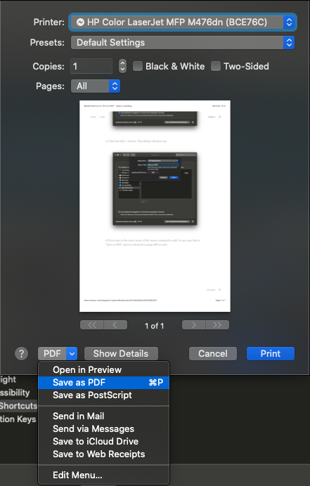 MacOS shortcut for "Print to PDF"
