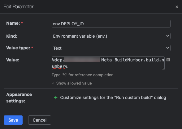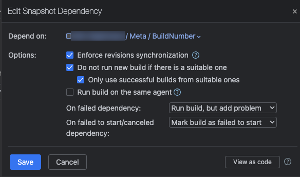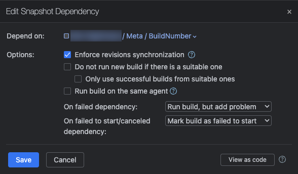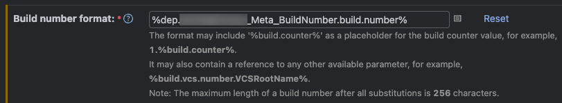 Lastly, this is optional, I like to sync the deployment build configuration's build number to the "BuildNumber" configuration. To do so, set the build number format to %dep.YourProject_Meta_BuildNumber.build.number%: